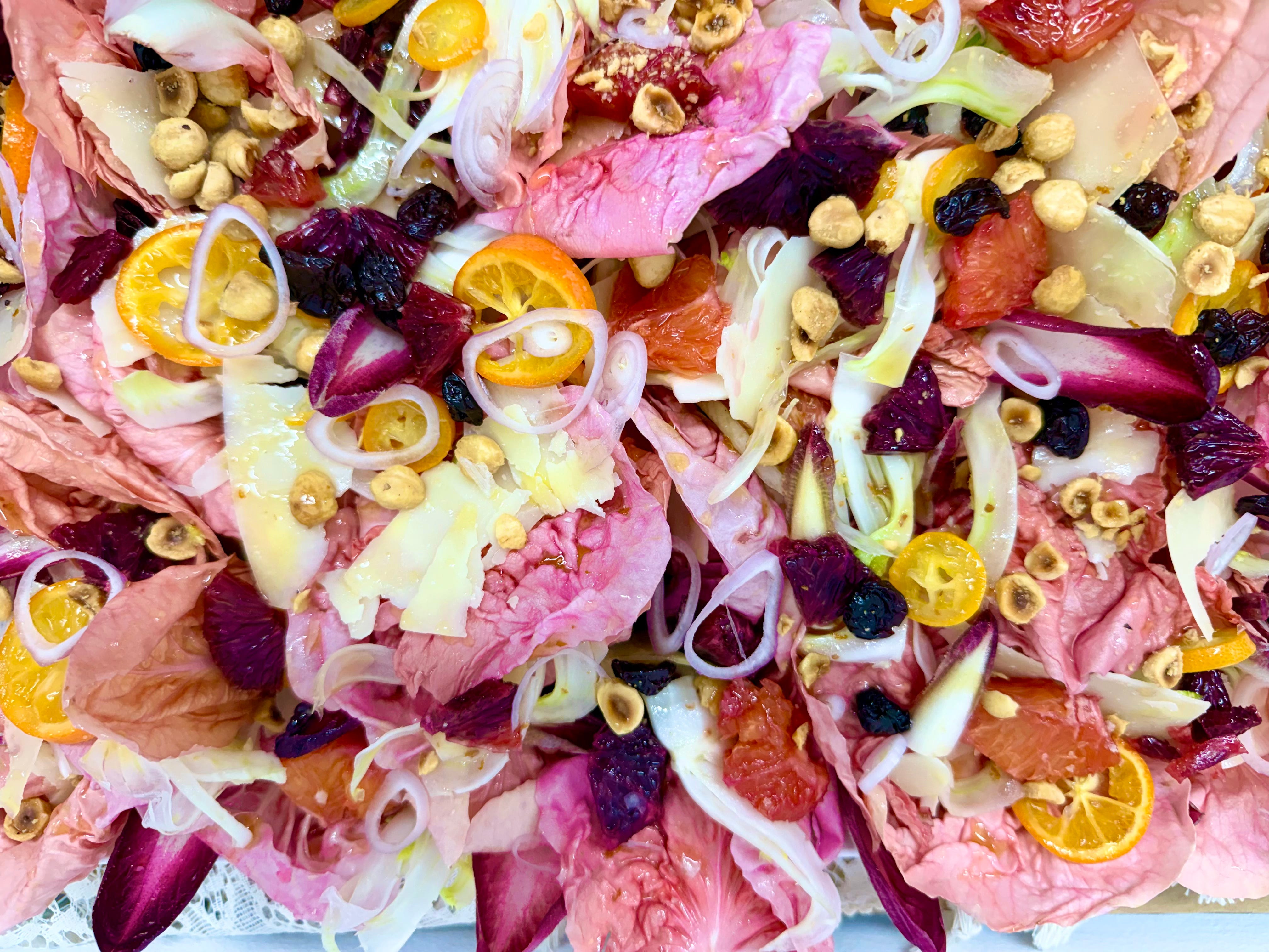 So I chose to go minimal, but beautiful. For the main event, a study in emerging spring colors: pink radicchio salad with blood oranges, hazelnuts, and thinly sliced fennel, alongside a winter Niçoise—confit tuna that shredded delicate and tender, jammy eggs dyed with beet juice, delicata squash, beets, green beans, olives.