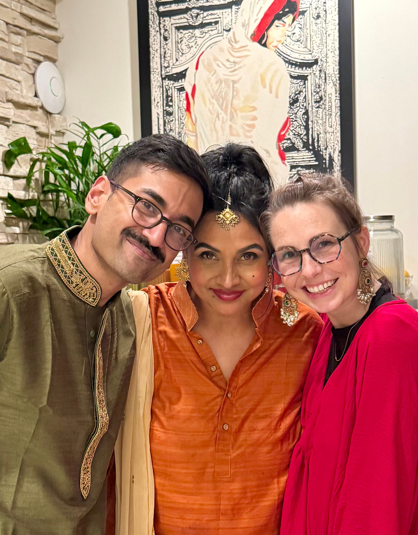Yas is not a deeply religious person. He spent a lot of his adult life at a distance from his faith and his culture, the way a lot of second-generation kids do when they’re trying to figure out where they fit in a world that doesn’t always make room for the in-between. But when we started planning our wedding, something shifted in him. He wanted to honor it. He wanted to claim it. We did a full desi wedding celebration, and his Uncle Barry stood up and offered prayers and words from the Quran, and my dad stood up and offered Christian prayers alongside his own words, and the room held all of it without flinching. I stood there between these two men, these two prayers, these two traditions reaching toward the same place, and I thought...this is exactly what it was always supposed to look like. This is the whole point.